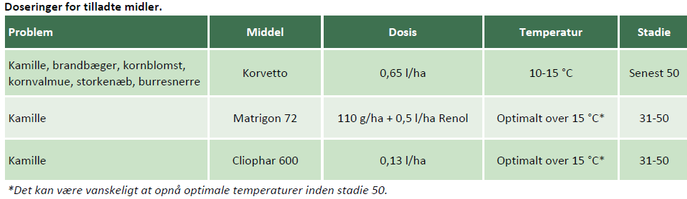 I de helt ubehandlede marker, skal der vurderes på mængden af ukrudt og tætheden af vinterrapsen. Ved bekæmpelsesbehov anvendes Korvetto, som har den bredeste effektprofil over for tokimbladet ukrudt. Der skal være gode dag- og nattemperaturer i dagene før og efter sprøjtningen. Sprøjt først på dagen, så midlet optages under stigende temperaturer.