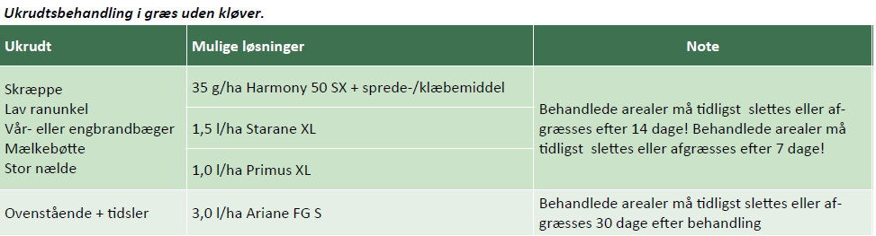I græs uden kløver, er der flere muligheder for at bekæmpe rodukrudt – se tabellen.