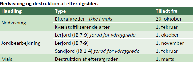 Efterafgrøder må nedvisnes fra 20. oktober, undtagen de kvælstoffikserende, der først må nedvisnes fra 1. februar. Overvej at vente med nedvisning af efterafgrøder til foråret, for at øge optagelsen og reducere udvaskningsrisikoen af kvælstof. Der kan dog være behov for at bekæmpe kvik, som kan betyde, at det giver mening at nedvisne efterafgrøderne. Gråbynke, tidsler m. fl. vokser ofte så svagt sent på efteråret, at det er vanskeligt at få god effekt af Roundup.