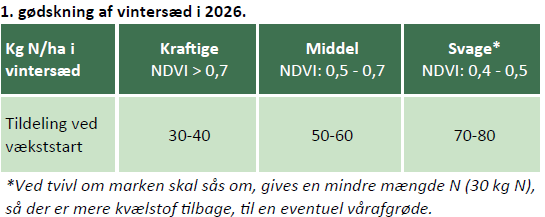 Nu er 1. februar passeret og det er tilladt at give gødning på arealer, hvor jorden ikke er frossen eller vandmættet. Efter en lidt kold periode, er foråret forhåbentligt snart på vej. Med den vinter vi har haft, er der mange arealer hvor det er tørt nok til at give gødning og så vårsæd meget hurtigt. Derfor kan det blive aktuelt at være klar til at køre gødning til vintersæden i løbet af nogle uger—vi skal helst ramme 1 tildeling ved vækststart.
