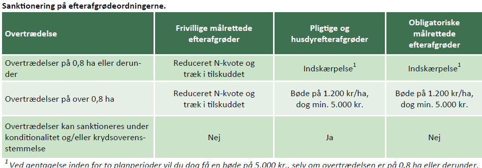 Målrettede efterafgrøder søges i en særskilt støtteordning. Hvis der i en kontrolsituation mangler målrettede efterafgrøder (eller alternativer), så mister man støtten til de manglende efterafgrødearealer og N-kvoten nedsættes i 2025/2026, svarende til de manglende målrettede arealer (110/175 kg N/ha).