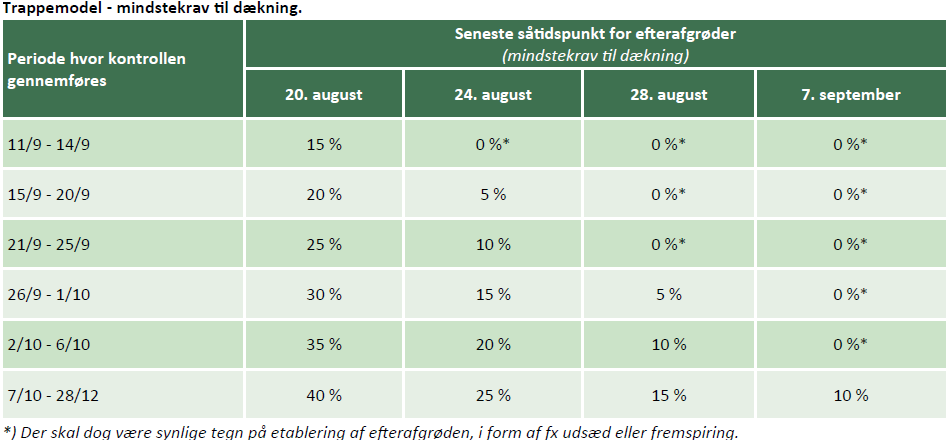 I kontrollen af efterafgrøder, vurderes der blandt andet efterafgrødens dækningsgrad (se billeder), om de anvendte arter er lovlige og, i tilfælde af præcisionsjordbrug, om man har dokumentationen i orden. Trappemodellen bruges både til kontrol af græsudlæg udlagt i foråret og til efterafgrøder, der er etableret før eller efter høst (se tabel).