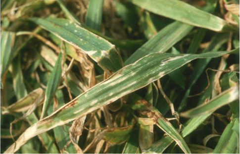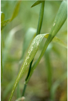 Manganmangel i vinterhvede og -byg. Bemærk de lyse pletter på bladene. SEGES.