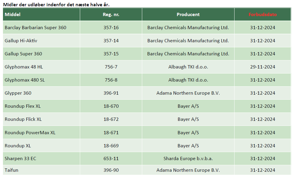 Midler på listen skal anvendes inden udløb. Senest ved udløb afleveres de på den lokale modtageplads for farligt affald. Med forbud menes der både brug og oplagring.