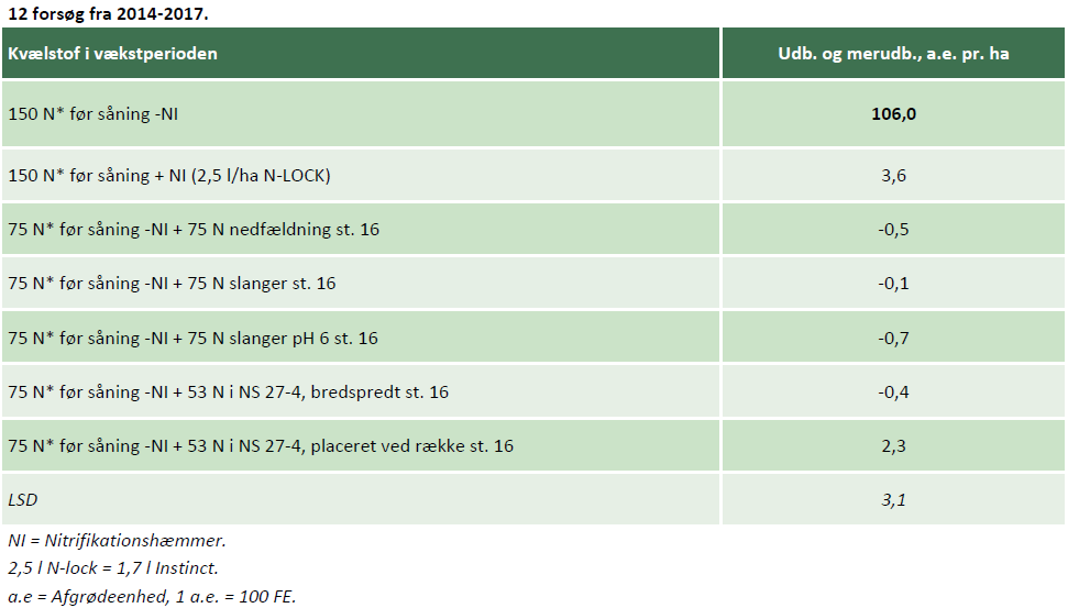 12 forsøg udført over 4 år viser, at udbringning af hele den planlagte gyllemængde før såning, tilsat en nitrifikationshæmmer, har givet det største merudbytte. Et brugbart alternativ til dette er udbringning af halvdelen af kvælstoffet i form af gylle før såning kombineret med placering af den resterende kvælstofmængde inde ved række i juni