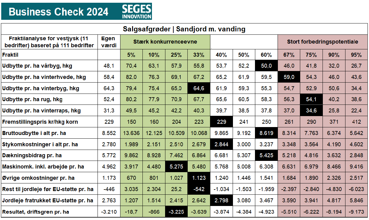 Fraktilanalysen for salgsafgrøder viser tallene for 111 bedrifter på landsplan med sandjord med vanding opdelt på fraktiler, så man kan se variationen. De sorte felter viser, hvor gennemsnittet af tilsvarende bedrifter i vestjysk ligger. Det er gennemsnittet af 11 bedrifter, med mere end 50 ha i salgsafgrøder.