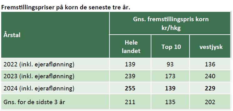 Tabellen viser at fremstillingsprisen for korn har ligget på et væsentlig højere niveau de sidste 2 år end tidligere både på landsplan og i vestjysk. I vestjysk har den dog været faldende i 2024, mens den på landsplan er steget yderligere.