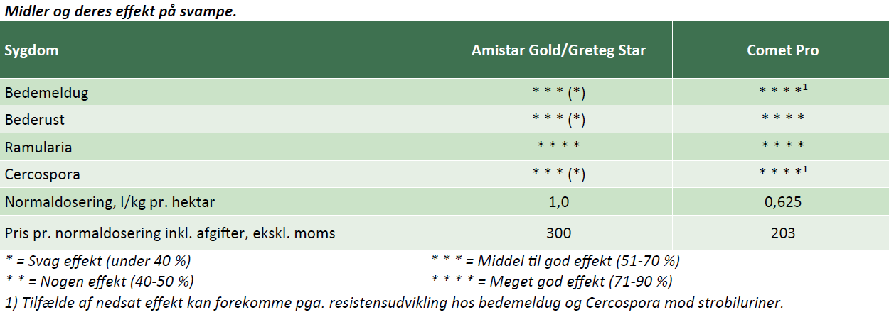 For at forsinke resistensudvikling anbefales det kun at anvende Comet Pro (ren strobilurin) en enkelt gang. Der anbefales 0,3 l/ha Comet Pro, hvor dosis ved højt smittetryk øges op til 0,6 l/ha. Ved behov for 2 behandlinger følges op med 0,5 l/ha Amistar Gold/Greteg Star. Det er især ved højt smittetryk, modtagelig sorter eller optagning efter midten af oktober, at det kan være aktuelt med 2 behandlinger.