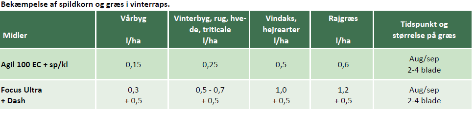 Spildkorn kan i store mængder hæmme udviklingen af den nysåede vinterraps. I sådanne tilfælde bør der bekæmpes spildkorn/græsser med Agil 100 EC/Focus Ultra, når kornet har udviklet 2-4 blade. Når man skal vælge mellem Agil 100 EC og Focus Ultra, er det vigtigt at notere sig, at Agil virker hurtigere på spildkorn, mens Focus Ultra virker til at have en bedre effekt på rajgræsset.