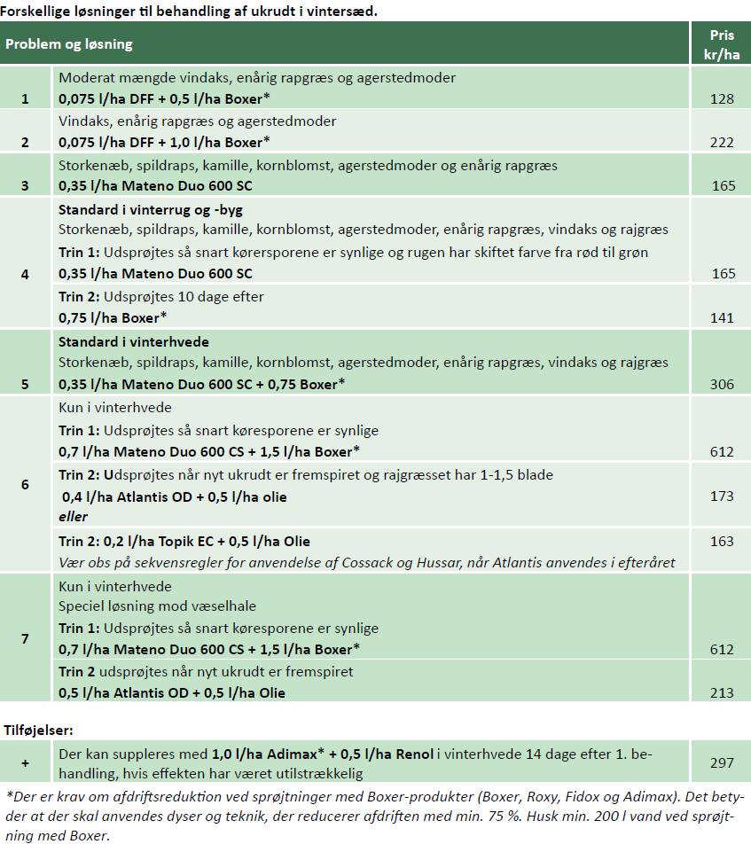 - Løsning 1 eller 2 anvendes i vintersæd med almindelig ukrudtsbestand. Løsning 1 er ofte tilstrækkelig i sent såede marker og vinterrug, mens løsning 2 kan anvendes ved lidt større mængder tokimbladet ukrudt og vindaks.